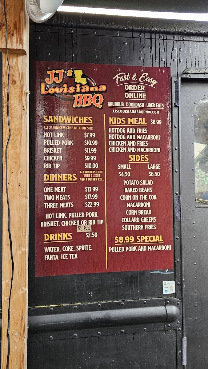 The menu at Jj's Louisiana BBQ offers a variety of delicious options, ideal for anyone craving authentic Southern barbecue. For sandwiches, diners can enjoy classics like the Brisket Sandwich, Pulled Pork Sandwich, and Rib Tips Sandwich. Other options include the Chicken Sandwich and Hot Links Sandwich, each offering a flavorful taste of BBQ for a quick, satisfying meal. For those looking for something more substantial, the dinner options include the 1 Meat Dinner, 2 Meats Dinner, and the hearty 3 Meats Dinner, perfect for those who can’t decide between the restaurant’s signature meats. Kids can indulge in the Chicken and Fries or Chicken and Mac N Cheese for a kid-friendly feast. Complementing the main dishes, sides like Mac and Cheese, Baked Beans, Collard Greens, Southern Fries, and Corn on the Cob add a comforting touch. To wash it all down, guests can choose from refreshing drinks, including Water, Iced Tea, and Coke. Whether you're in the mood for a quick sandwich or a full Southern meal, Jj's Louisiana BBQ serves up tasty options that are sure to satisfy.